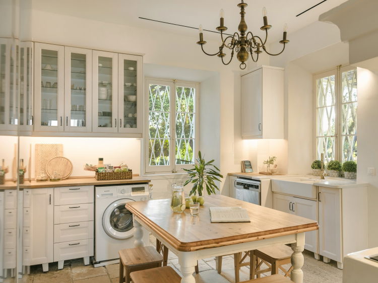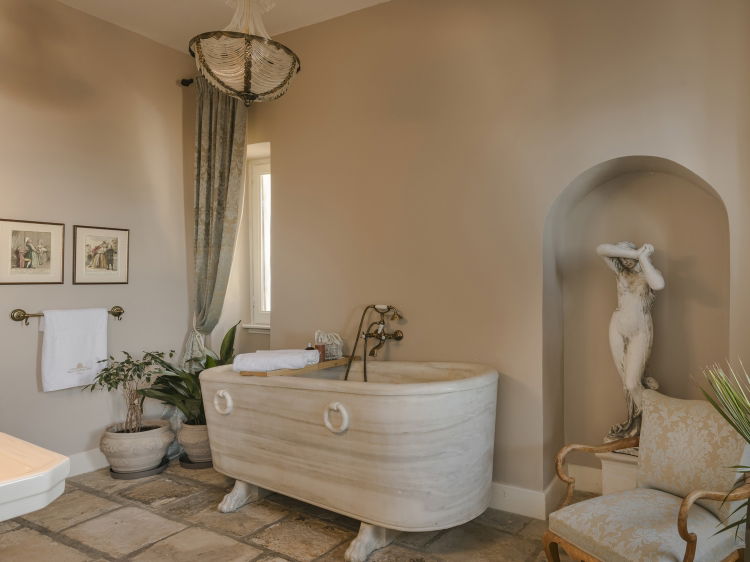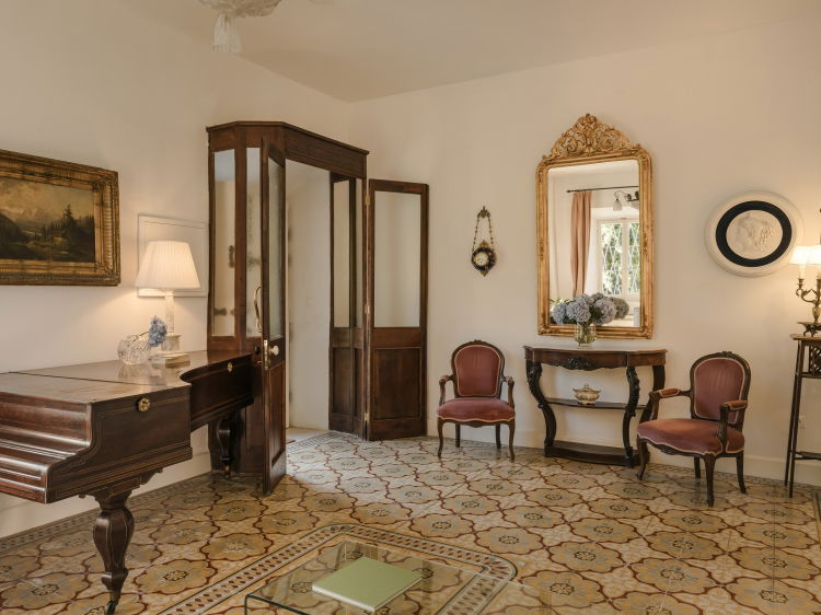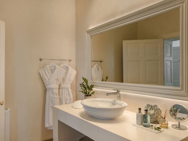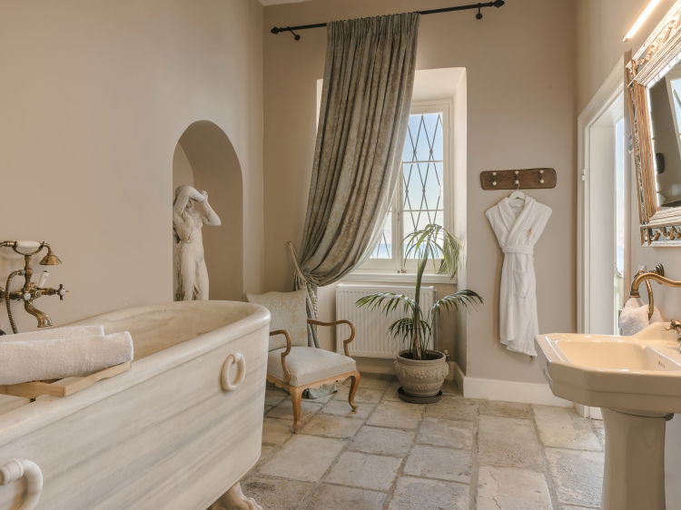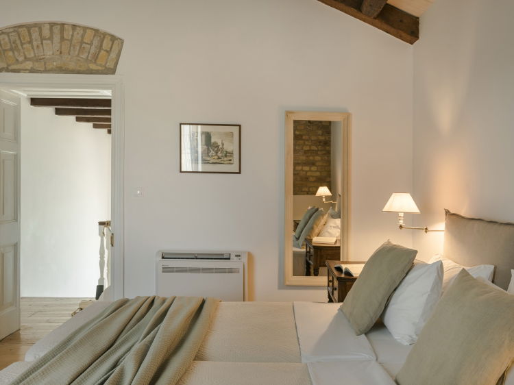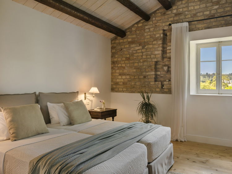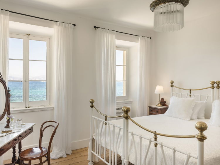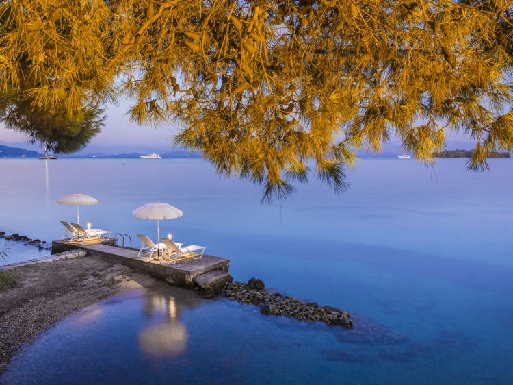 The accommodation spreads over three floors, with common areas on ground floor and five en-suite double and twin bedrooms in the upper floors: On the first floor, the Cyclamen master bedroom provides bay and beach views, paired with a spacious drawing room and a beach-view shower room. The Belladonna bedroom also on this floor, offers panoramic views of the Ionian Sea. The second-floor houses three bedrooms: Calla, Magnolia, and Mallow. These are named after garden flowers and equipped with antique furniture and modern beds. Calla and Mallow face the sea, while Magnolia overlooks the lush gardens. All the rooms are equipped with air conditioning. Wireless fast internet is available both inside the house and in the outside areas of the property. The villa is staffed with a team that includes a house manager, maid, breakfast cook, caretaker and gardener. Breakfast is served daily except on Sundays. Besides the direct beach access there’s also a heated swimming pool and a tennis court for guests to enjoy.